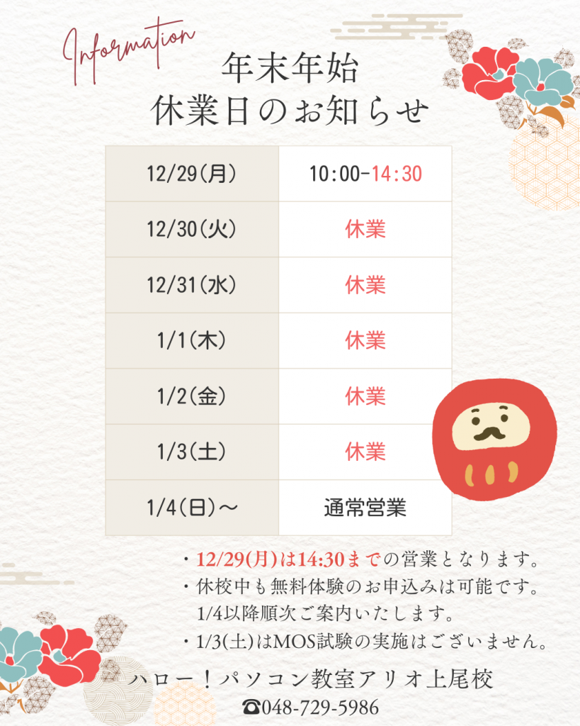 アリオ上尾校★年末年始の休校日のおしらせ